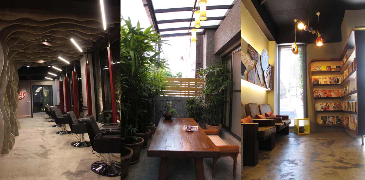 (左)一樓舒適的等待區、(中)一樓專業的美髮區