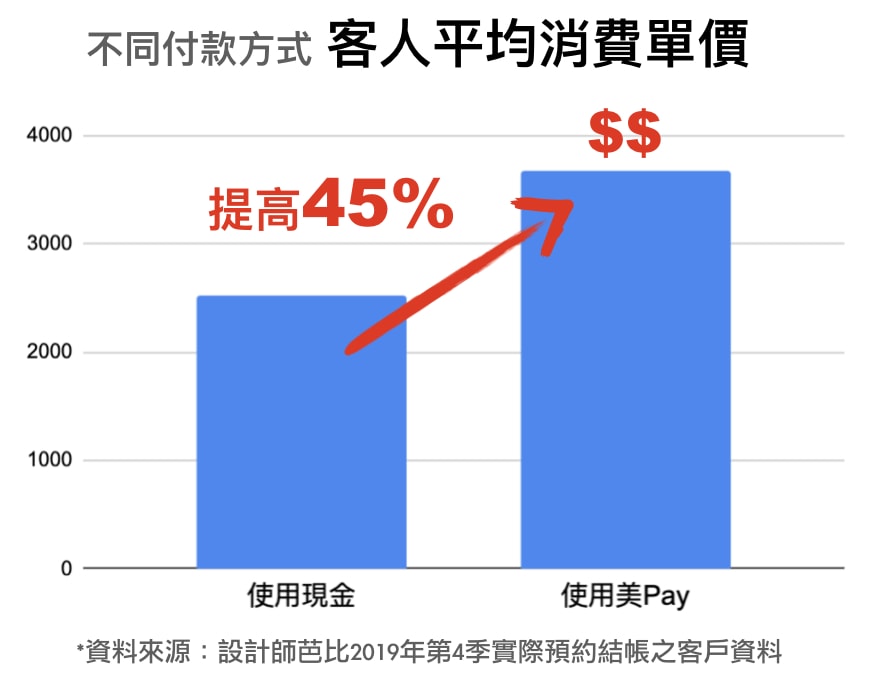 國內外有多篇的消費者研究報告都指出:『無現金』的消費,容易讓人消費更多!根據美配的統計實證,採用美Pay支付的消費者,平均消費金額比起一般消費者提高30%以上!以芭比的實際案例來看,使用美Pay消費者的消費金額更是大幅增加了45%!